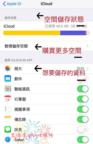 包含儲存空間狀態 / 購買空間 / 儲存的資訊內容 / 雲端備份